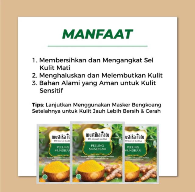 Kamu tinggal mengaplikasikan krim peeling dengan . Jual peeling mundisari/masker mustika ratu 60//125 g. Bersihkan wajah menggunakan makeup remover (kalo sebelumnya kamu pake riasan wajah, kalo ga ya ga usah) lalu seka menggunakan kapas. Untuk kulit berminyak gunakan 2 kali seminggu dan untuk kulit normal cenderung kering gunakan produk seminggu sekali. Biarkan 1/2 kering, lalu gosok perlahan dengan .